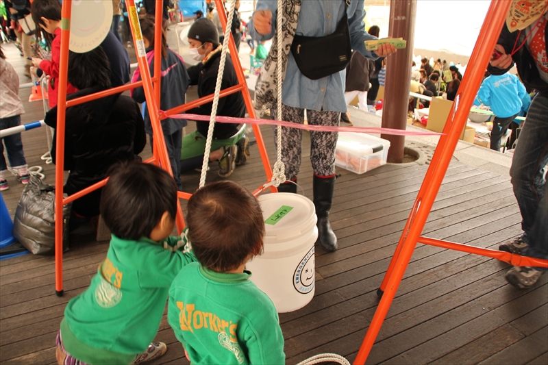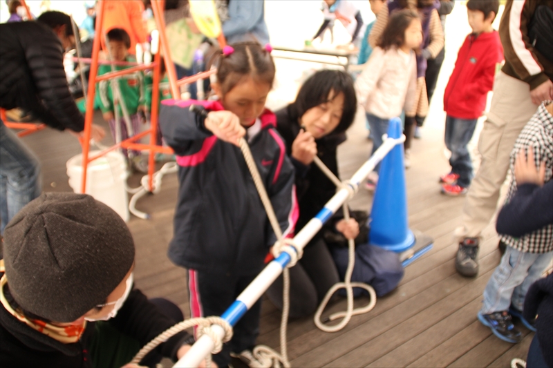 2013年3月10日(日)、神戸市垂水区にあるマリンピア神戸で開催された「イザ!カエルキャラバン!in たるみマリンピア」に出展してきました。今回の実施したプログラムは、「ロープワーク王は君だ!」と題したロープワークのプログラムです。「本結び」と「巻き結び」をしっかりとレクチャーした後、その二つの結び方を駆使してゲームに挑戦!!!ロープをうまくつかってバケツを持ち上げるまでのタイムを競うというものです。午後からは強風と降雨のため、残念ながら防災体験プログラムは中止となってしまいましたが、たくさんの方々にご参加いただき、充実した1日となりました。