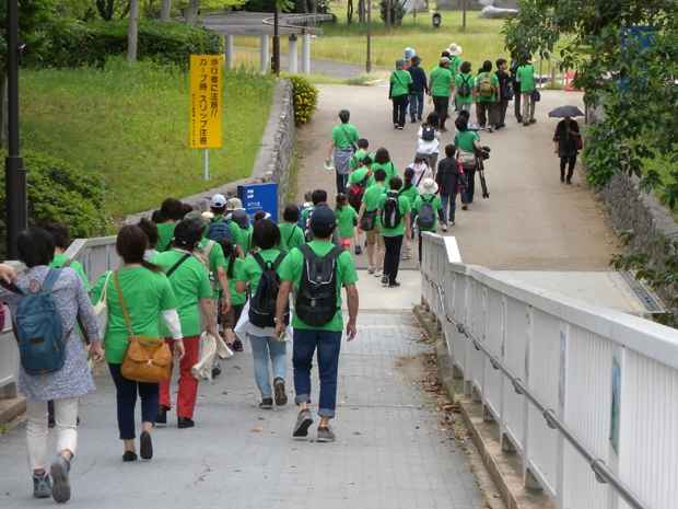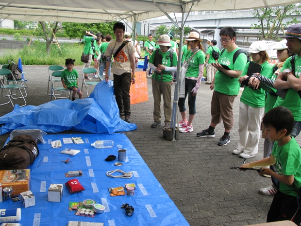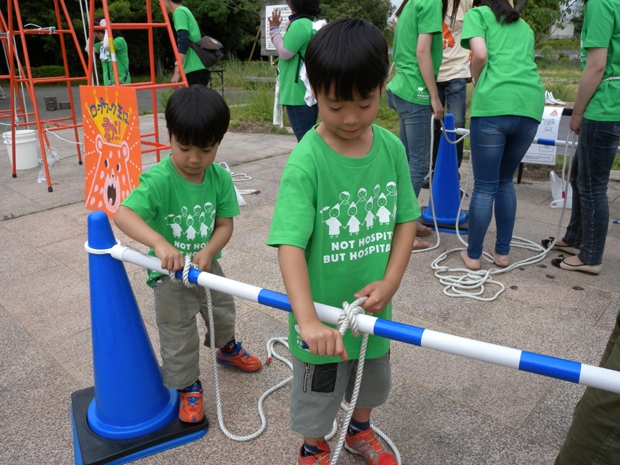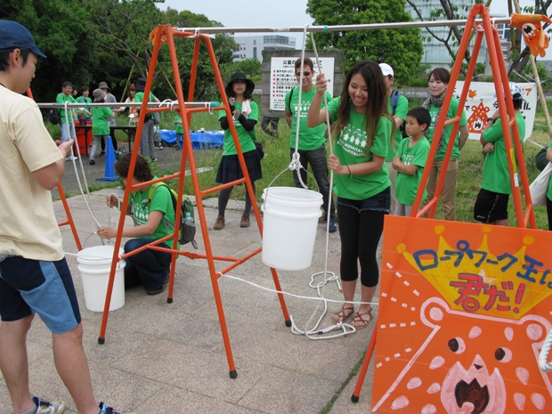 当日は、三宮からポートアイランドにある「チャイルド・ケモ・ハウス」までの約4.5kmを、おそろいの緑色のTシャツを着て歩く、チャリティウォークイベントで、約580名の方々にご参加頂き大盛況となりました。 「レッドベアサバイバルキャンプクラブ」としては、“子どもたちの生き抜く力”を育む3つの体験ブースを出展。 それぞれのブースで課題にクリアすれば、そのプログラムの技バッチがもらえるという仕組みで、大人も子どもも一生懸命プログラムにチャレンジしていました!!