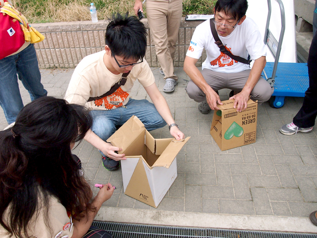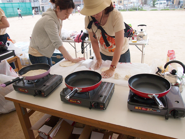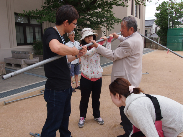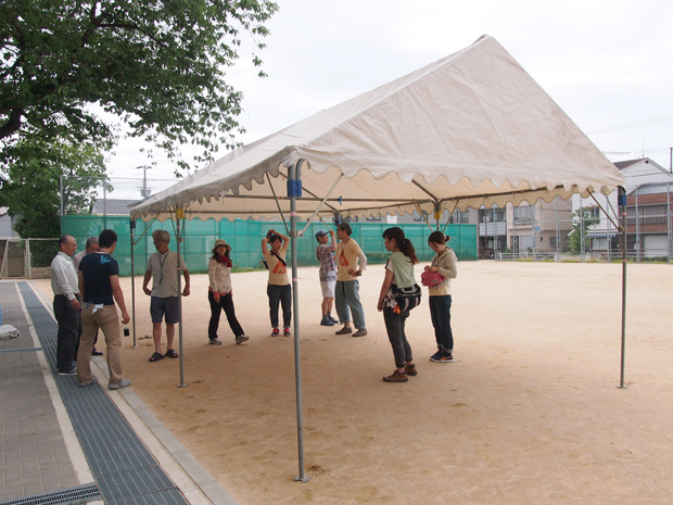 あいにくのお天気でしたが地域人材支援センターの職員の方、地域の防災福祉コミュニティ、語り部の方に手伝っていただき、建てたテントの下で雨に負けず活動することができました。